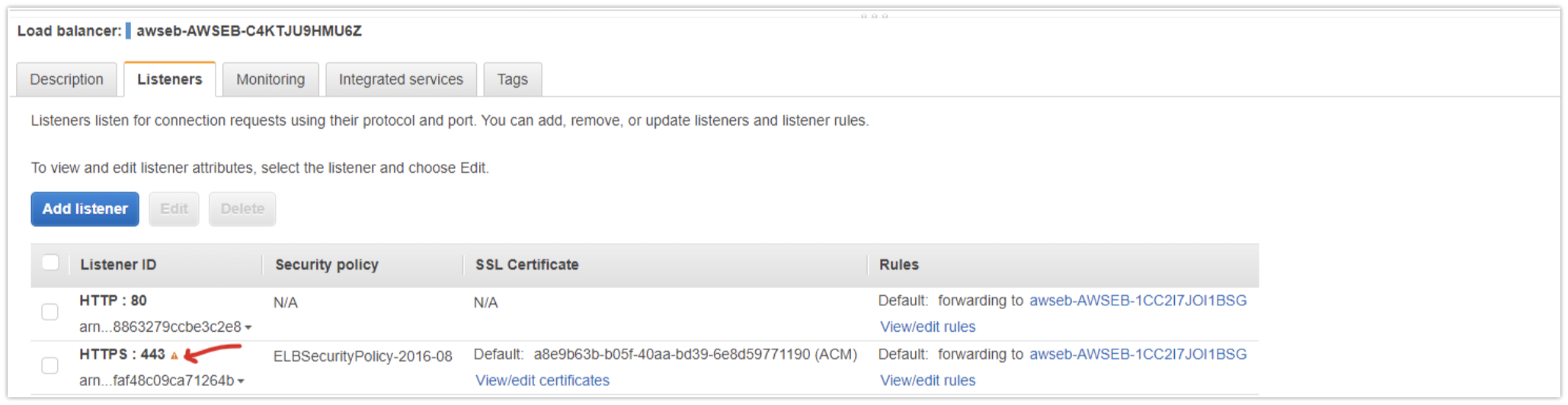 If a small orange warning icon appears next to the port 443 listener, add an Inbound rule for port 443 to the security group.