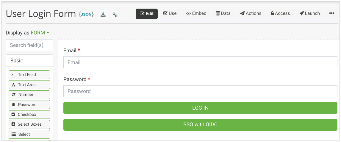 Modify the Portal Base User Login form to enable SSO authentication for SAML users accessing the Developer Portal. Before this workflow can be established, ensure you have your [**OIDC Application**](https://help.form.io/developers/auth/oauth#oauth-application-setup-overview) properly configured within the Portal Base Project.&#x20;