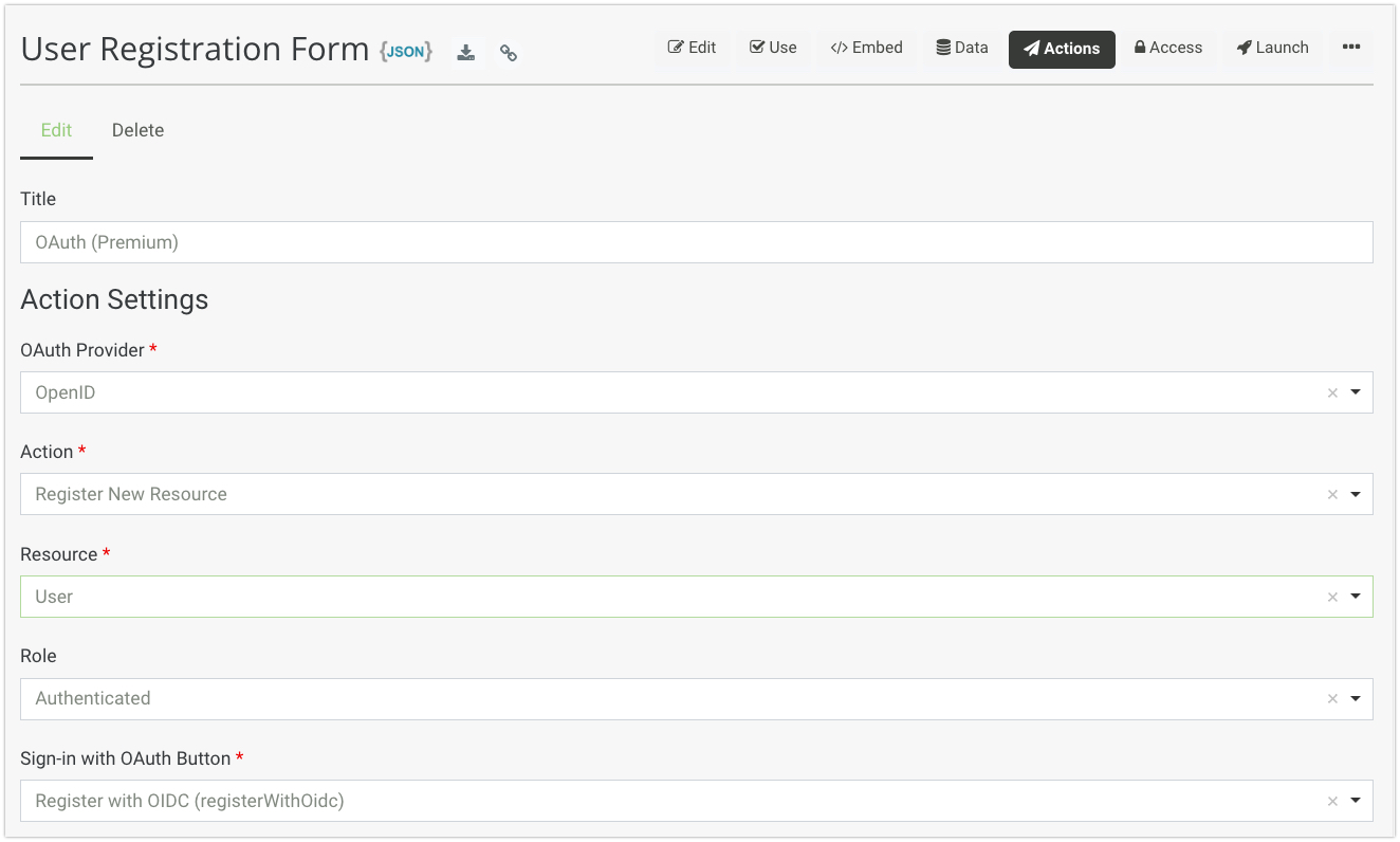 3. Add an [**OAuth** **Action**](https://help.form.io/userguide/forms/form-building/actions#oauth) to the Registration form and modify the following **settings**