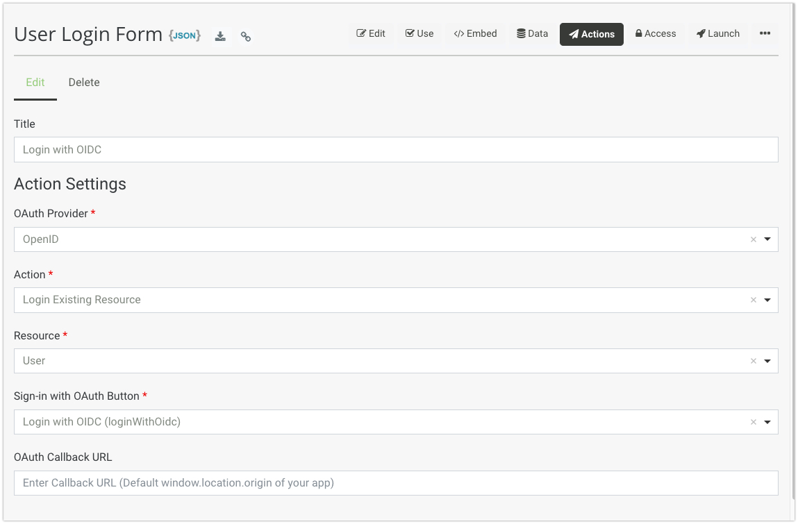 Once these conditions have been met, the User Login form can be configured to authenticate the OIDC User against the User Resource within the project.&#x20;