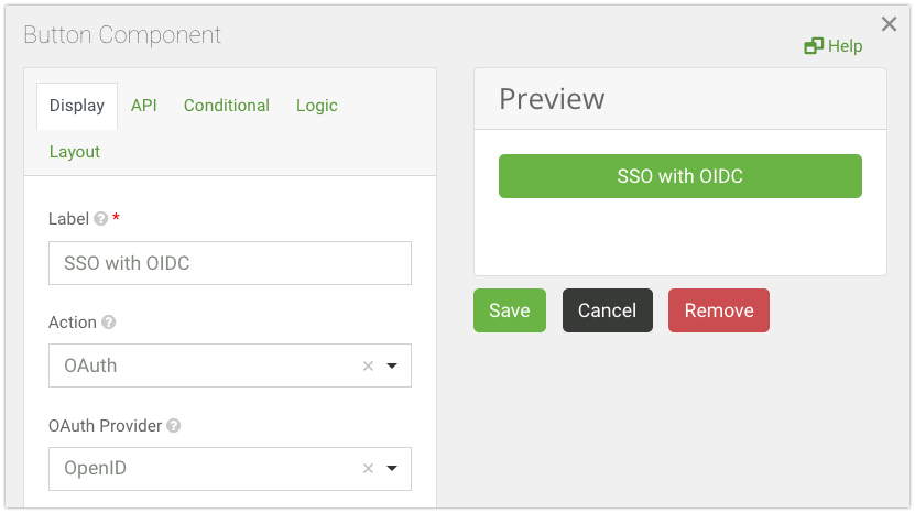 3. Add a **Button** component called **SSO with OIDC** and configure the following settings