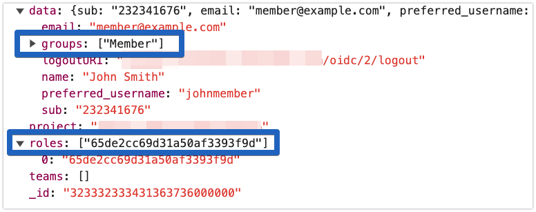 The authenticated OIDC user should carry the OIDC Group Role (Member) as well as the correct Form.io Role ID (Authenticated 65de..) within the metadata of the user object. This was accomplished in the previous step by mapping the OIDC group role to the Form.io Role configured within the OAuth action.