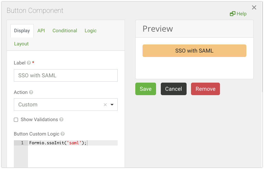 Modify the Portal Base User Login form to enable SSO authentication for SAML users accessing the Developer Portal. Before this workflow can be established, ensure you have your [**SAML Applicaiton**](https://help.form.io/developers/auth/saml#introduction) properly configured within the Portal Base Project.&#x20;