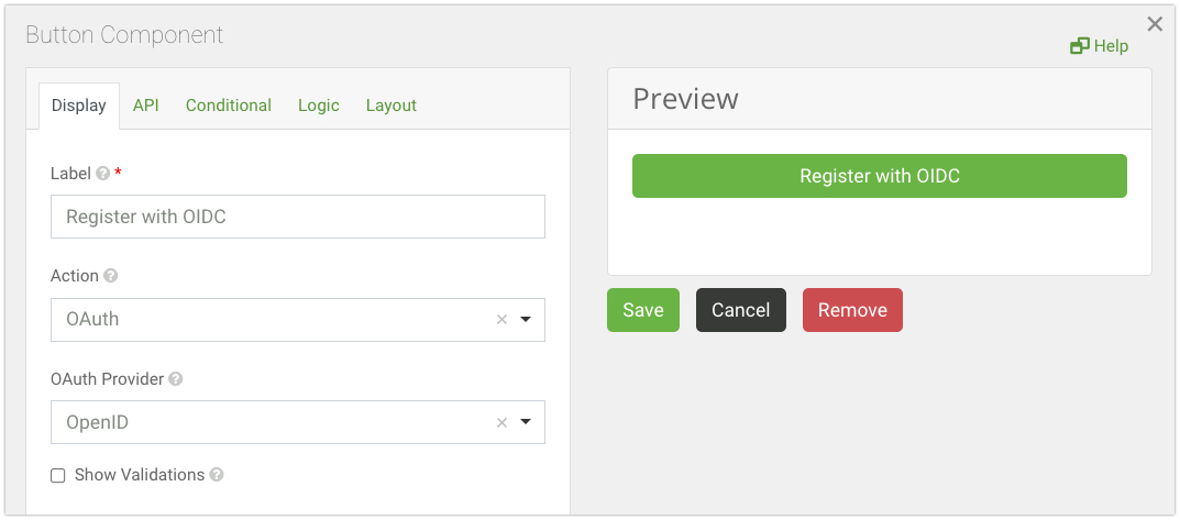 3. Add a **Button** called Register with OIDC and modify the following **settings**