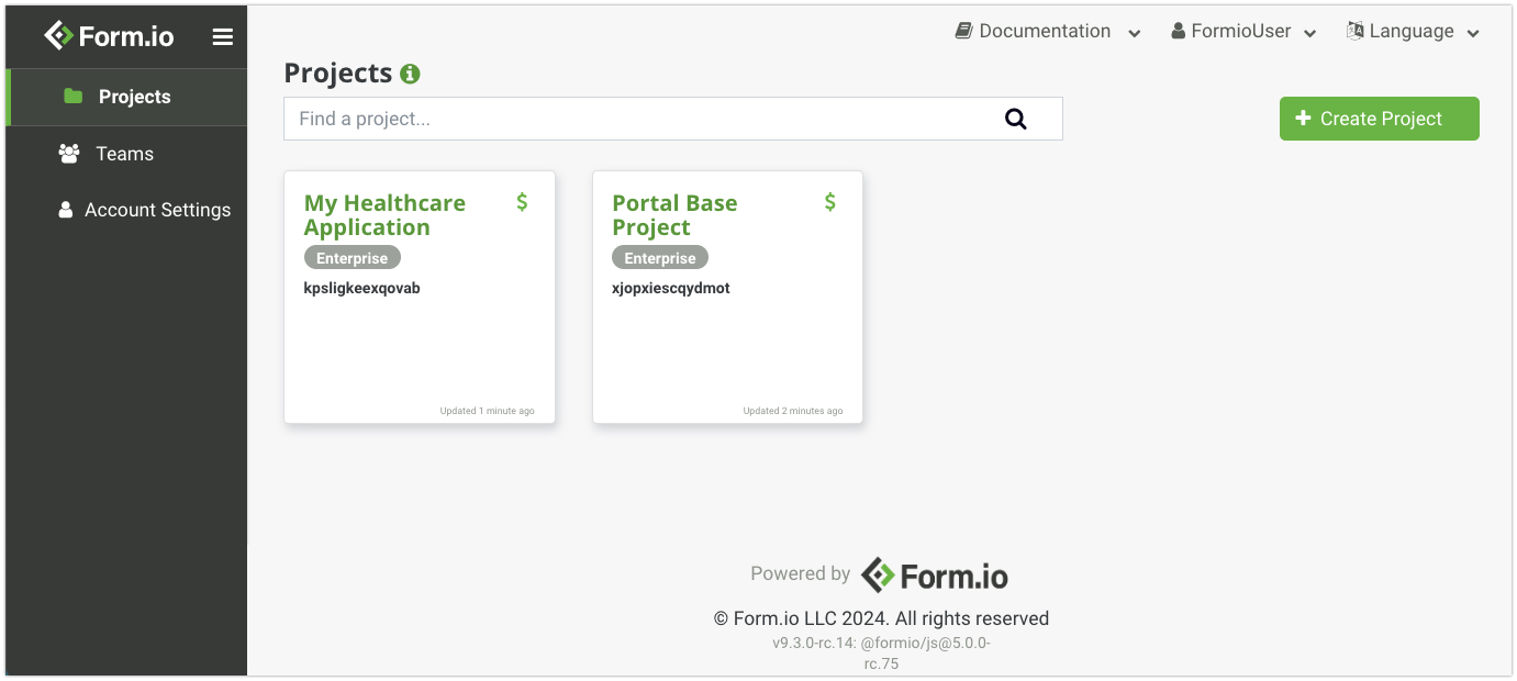 The Form.io Developer Portal is an application, and is the main landing page when authenticating into the Form.io platform. Here you can manage projects, teams, and environment License(s). Click the image below to review the different elements and features found on the Form.io portal page.