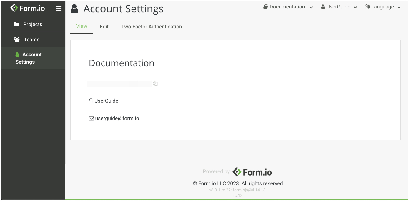 Click the Documentation guide for quick access to the Form.io Help site, API Documentation, Examples, and more. Click your Username to access Account settings for updating profile information or logging out of the platform.