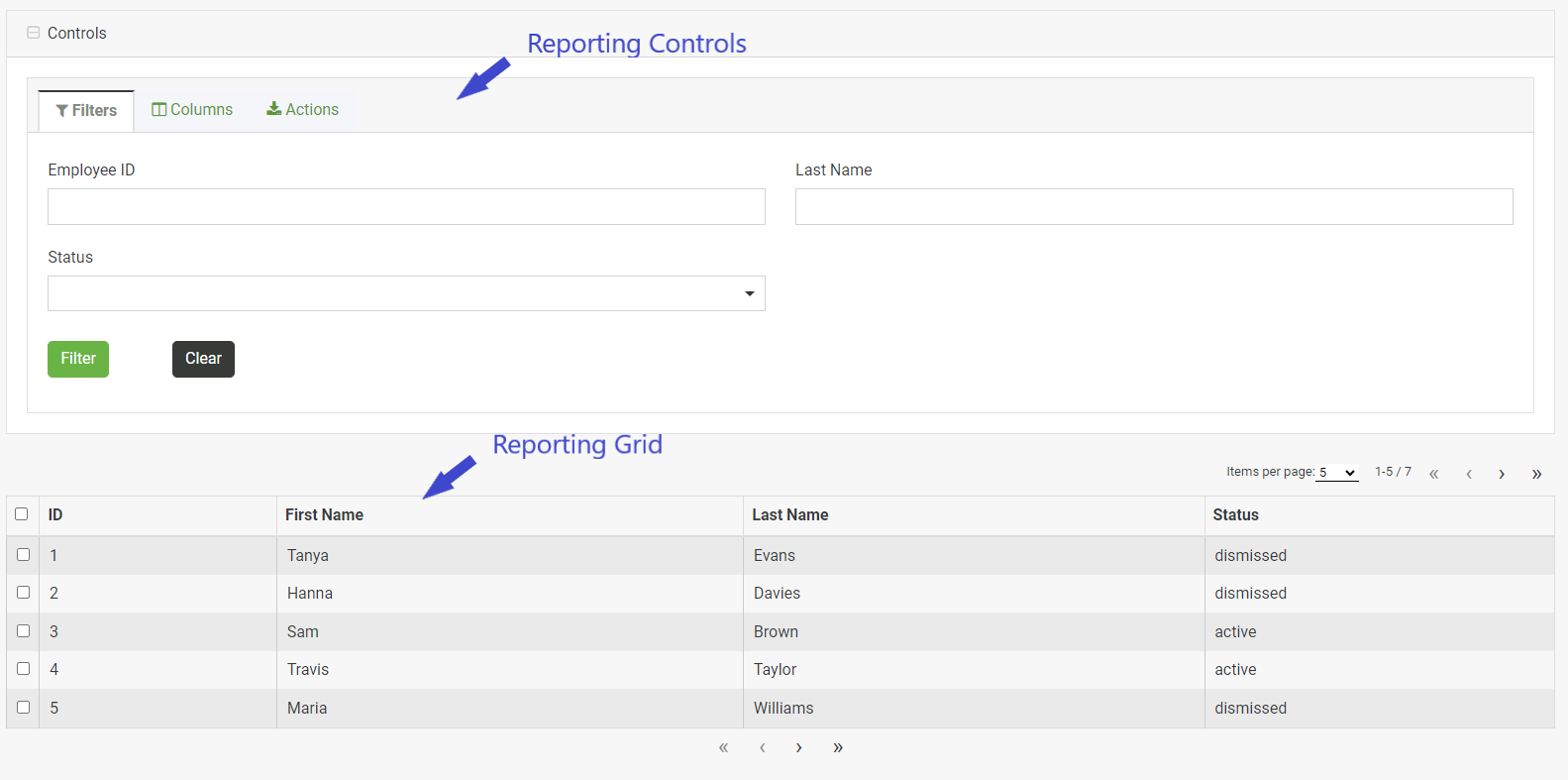Reporting Grid. This is the main part of the report that displays the report data. It provides the ability to paginate and sort data as well as select rows. Additionally, when the Reporting Controls are disabled, it gives the ability to filter data by columns and control the visibility of columns.